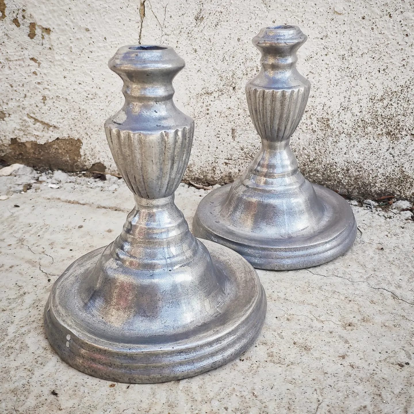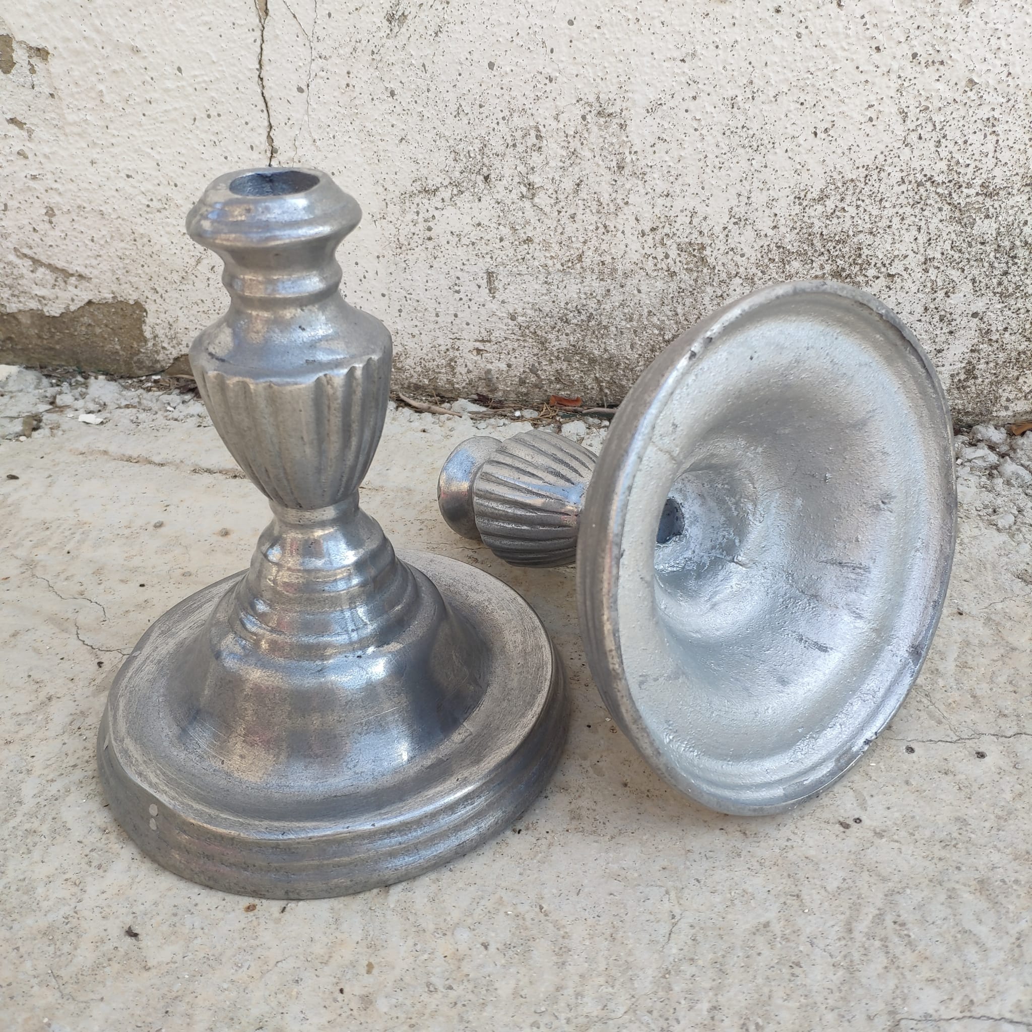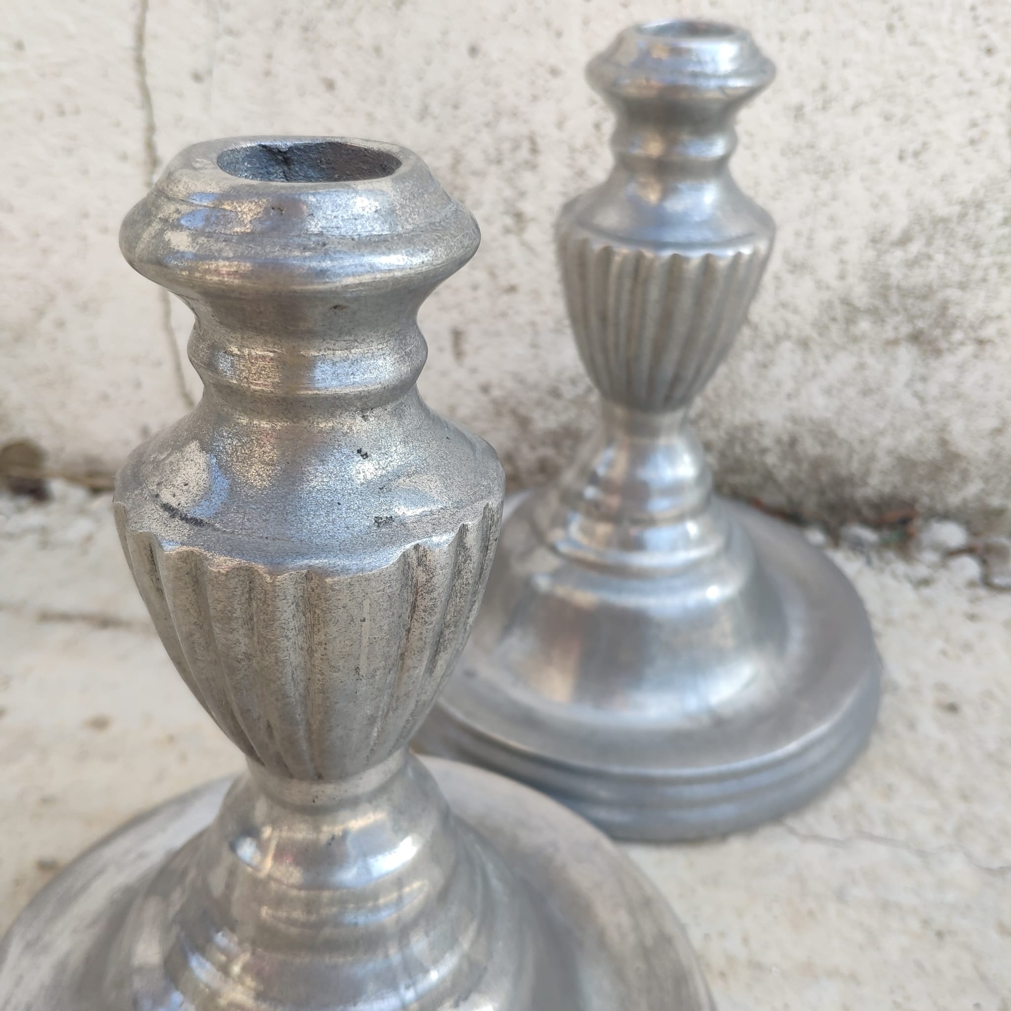 Precioso par de candelabros de metal en color plata vieja.