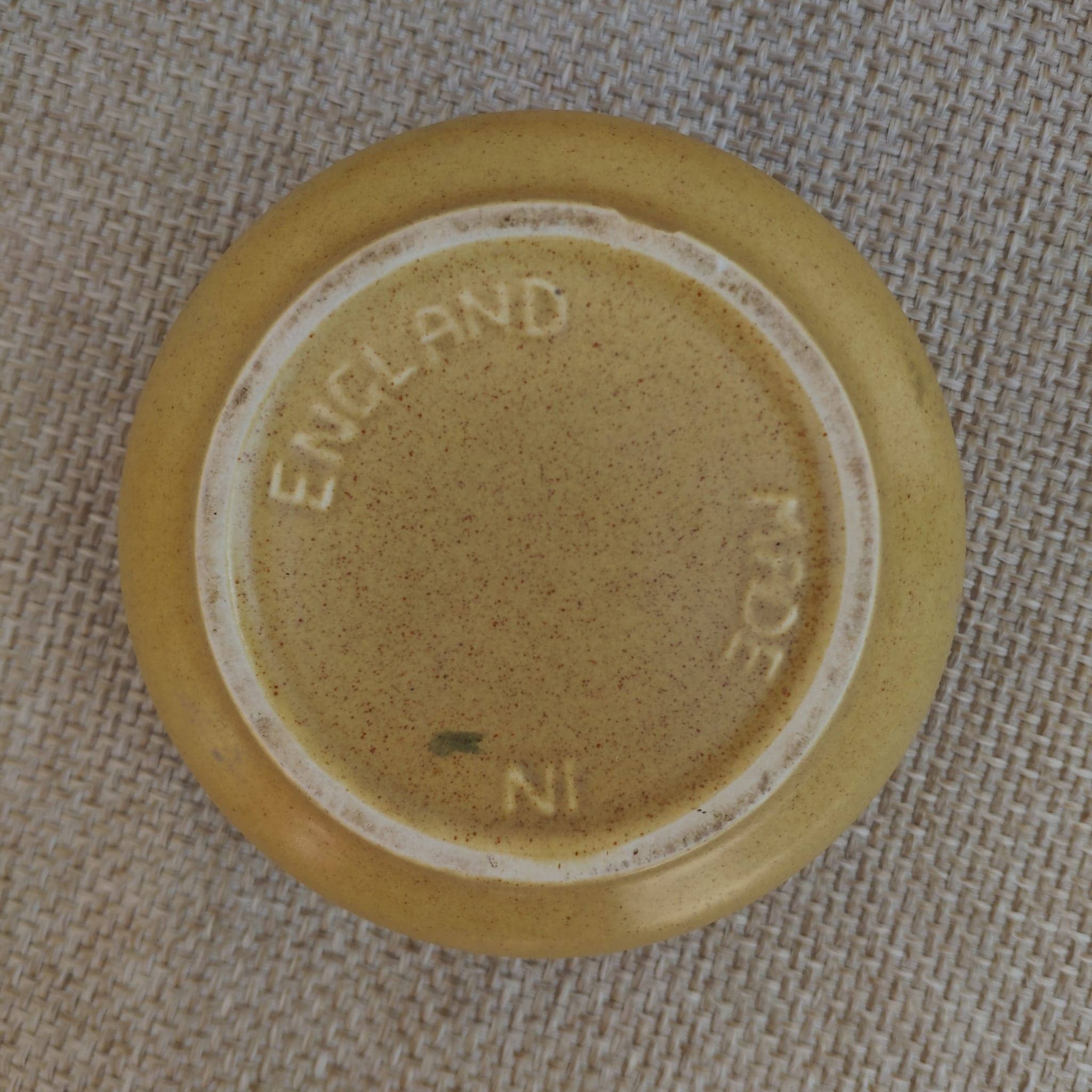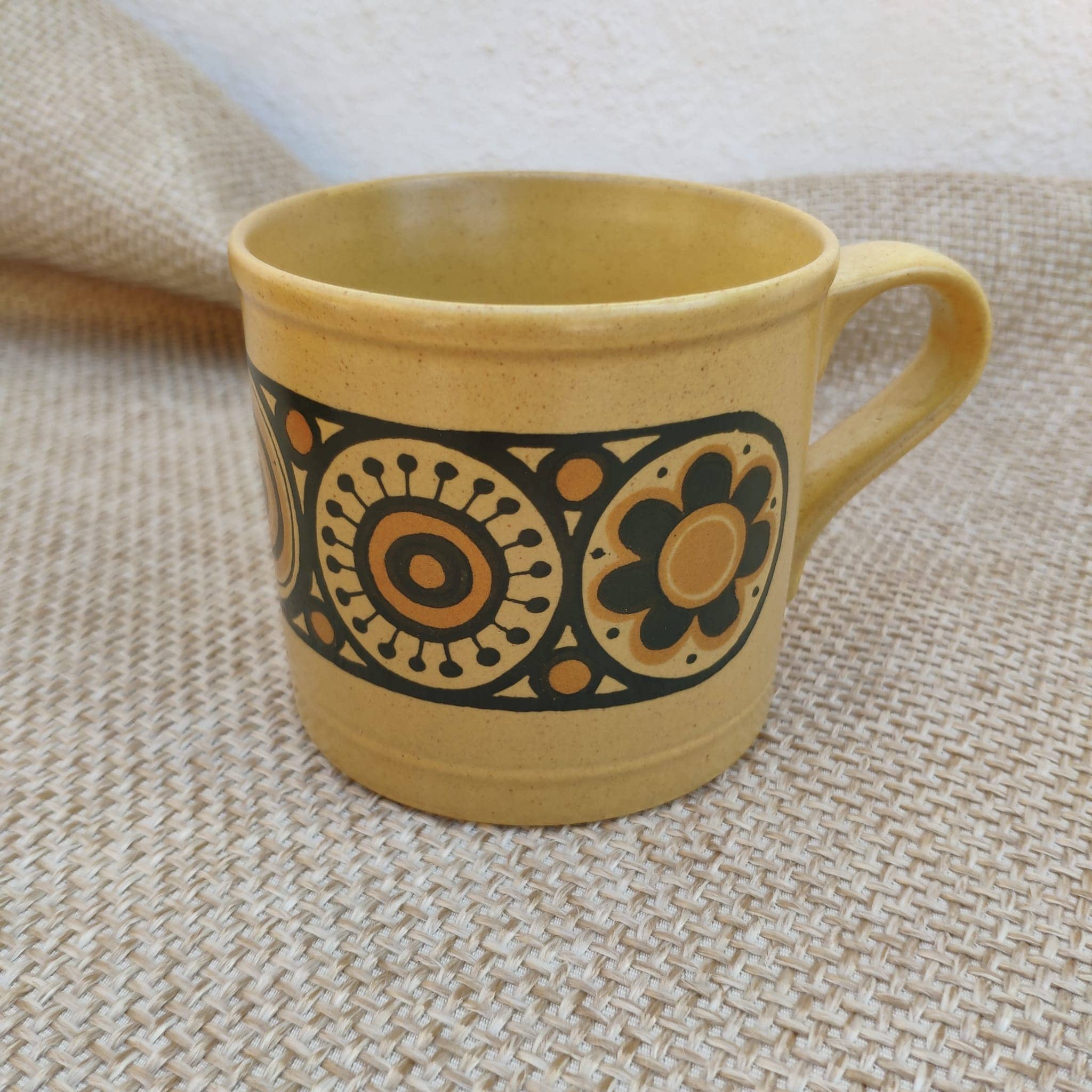 Hecho en Inglaterra. Fondo de color mostaza con un fabuloso diseño retro alrededor de las tazas de temática floral. Años 70