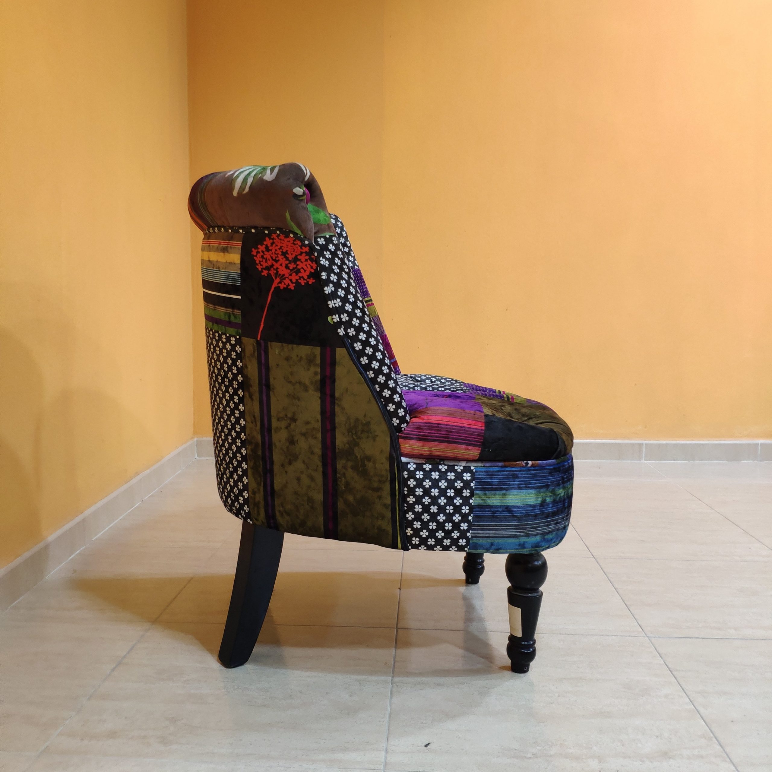 El asiento de terciopelo con botones llaman la atención. Combina bien como elemento decorativo en interiores de diseño ecléctico o boho.